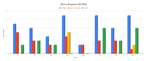 In the second quarter of 2024, we received 20 assistance requests and were able to support 9 of them, which represents approximately 45% of the total cases. Unfortunately, the remaining 55% of the requests were ineligible for support or required additional funds for assistance. Furthermore, through our service program, which offers help with small tasks around the homes of members of our church, particularly widows, we were able to assist three members with projects in their homes. If you or someone you know could benefit from this service, please contact us at mercyprojects@midwaypca.org.