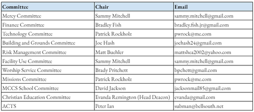 Please note that committee assignments will be updated before the end of January. We ask for your prayers as the Deacons transition into their new roles and continue the work of faithfully caring for the needs of the church and its members.