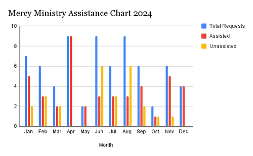 As we reflect on 2024, the Mercy Ministry received 70 assistance requests throughout the year. Of these, we were able to assist 44 cases, which represents 63% of the total. Unfortunately, 26 requests (37%) were either ineligible for support or required additional resources beyond what we could provide.