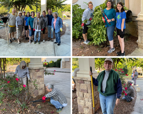 - We appreciate the church members (Angel & Bob Tango, Kim Washington, Carolyn, Becky Lewis, Katie Keel, Jennifer Siewert, Patti Brandenburg, Donna Carter, and Ken Dewhurst) who were able to contribute their time and talents to some very much needed grounds beautification projects. What an energetic group showed up to help! We are very blessed! (See 2nd image below).