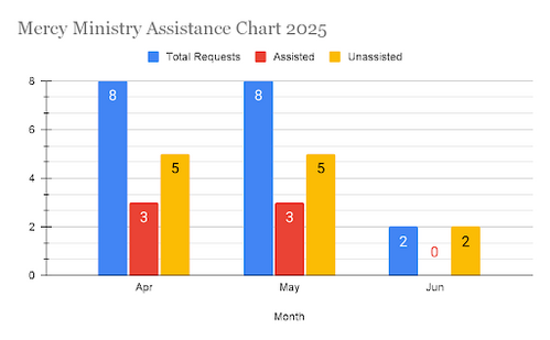 In the second quarter of 2025, Mercy Ministries received 18 assistance requests. Of these, we were able to support 6 cases (33%), while 12 requests (67%) were unassisted due to factors such as prior recent support, location outside our coverage area, lack of response, or limited available funding.